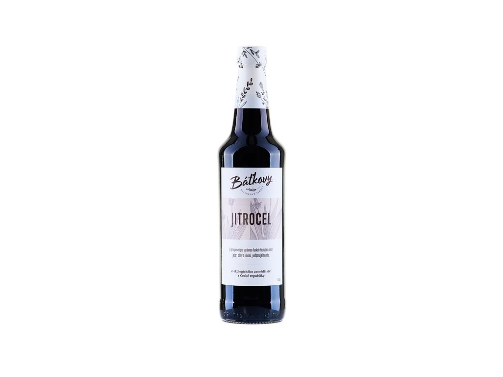 bylinný extrakt min. 60 % (pitná voda, bio jitrocel kopinatý*), sacharóza, kyselina: kys. citronová, konzervant: sorban draselný.Jitrocel byl vypěstovaný v kontrolovaném ekologickém zemědělství v České republice. Neobsahuje umělá sladidla, barviva, aromata ani zahušťovadla. Bez lepku, bez laktózy, bez GMO.