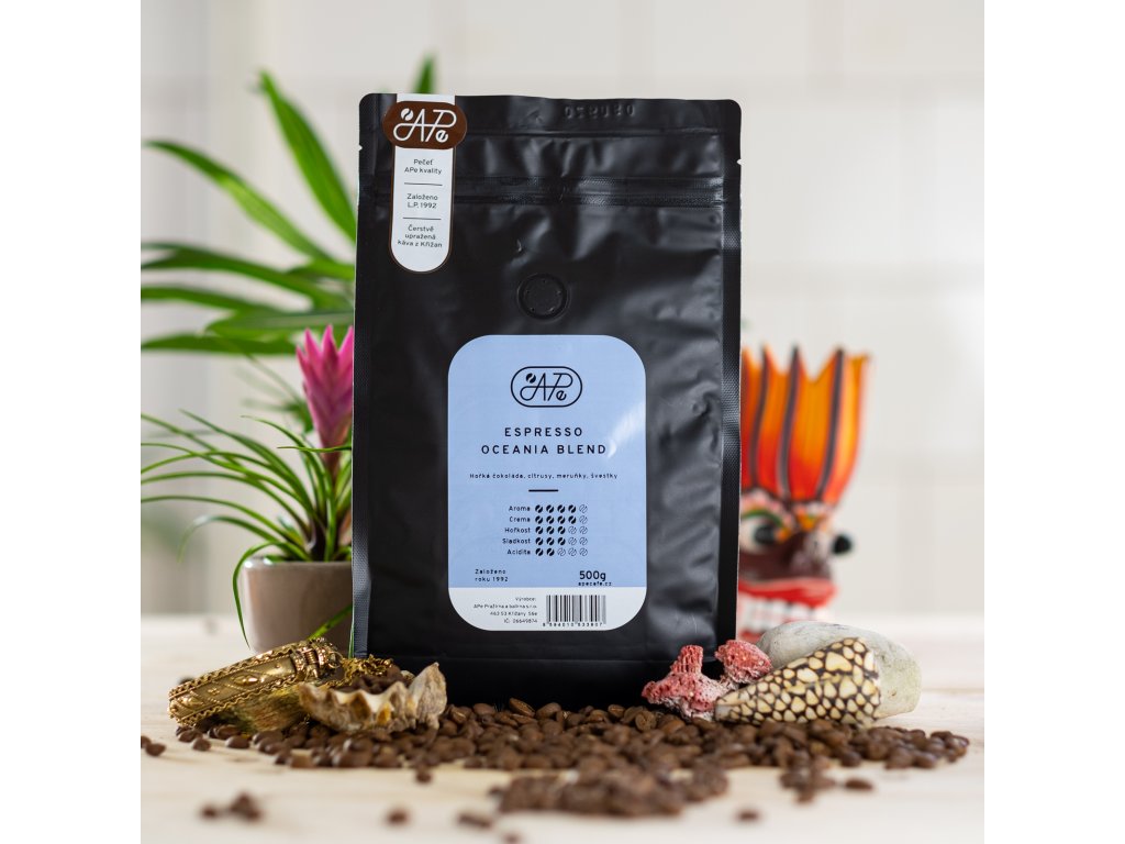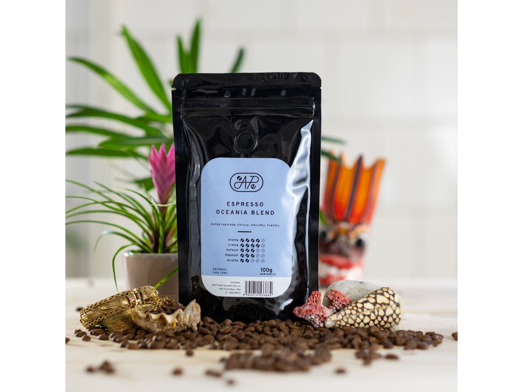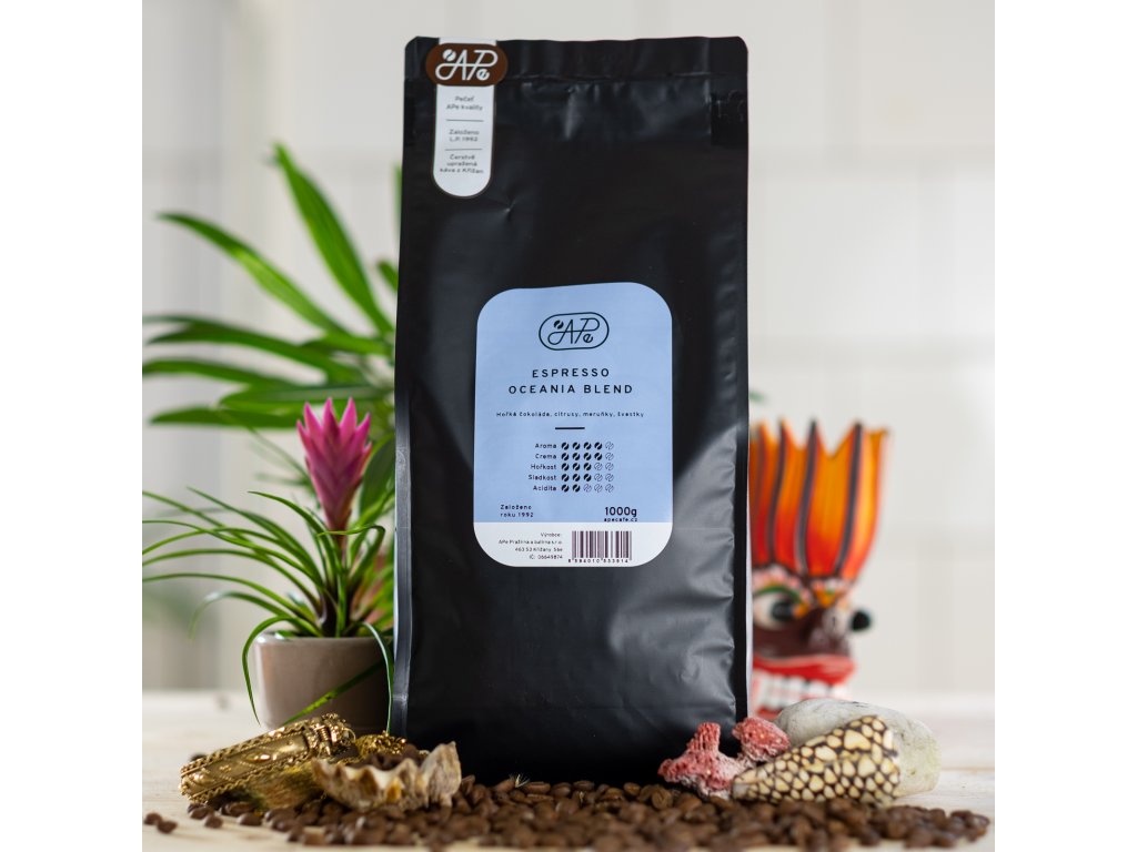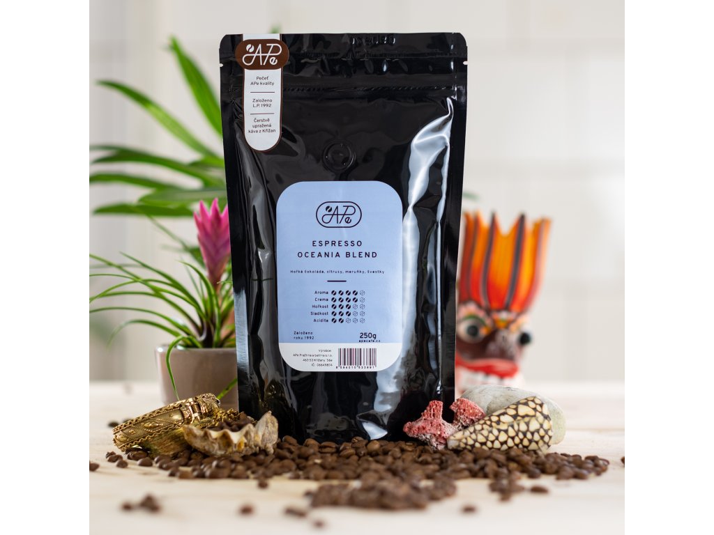 Směs vybraných 100% arabik Oceania Blend je tvořena z poloviny kávou Indonésie, čtvrtinou Indie Plantation A a čtvrtinou Papua - Nová Guinea.
