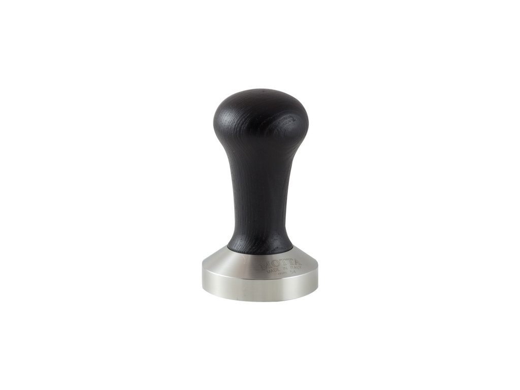 Profesionální tamper z nerezové oceli o průměru 54 mm a s ergonomickou rukojetí ze dřeva v syté černé barvě.